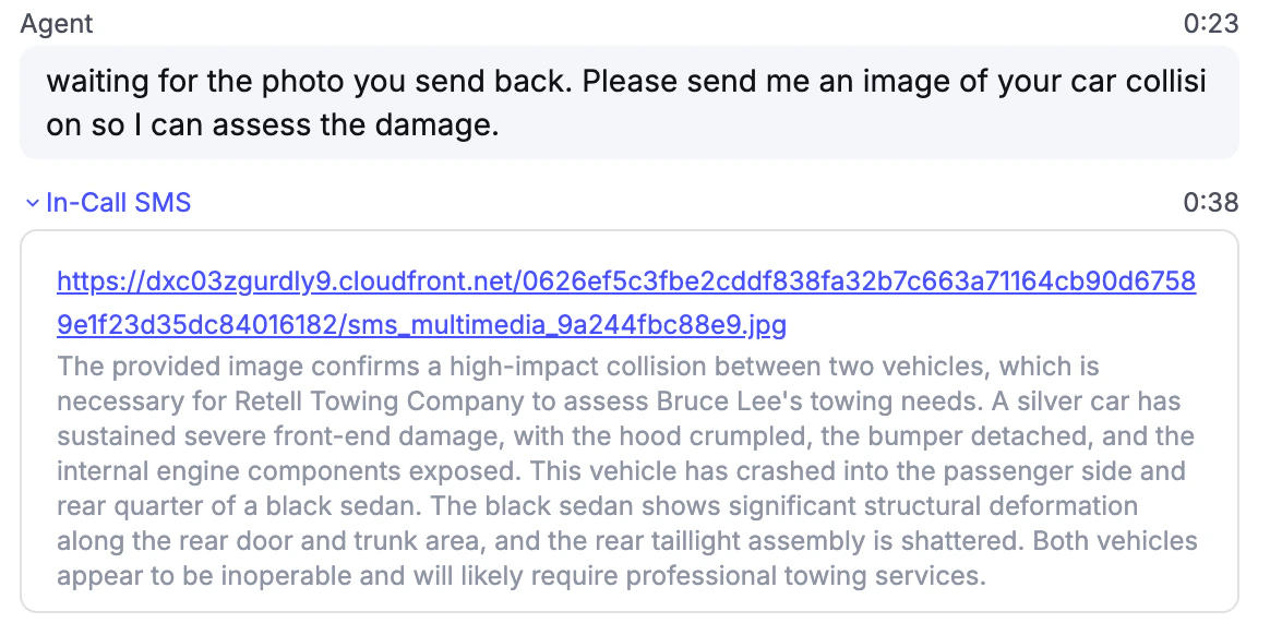 Agents can receive and understand SMS messages during an active phone call — even if the agent has not sent any SMS. This allows users to send supplementary information mid-conversation, such as a photo of a document, a screenshot, or a reference number. For Retell Twilio numbers, this works out of the box without enabling SMS. For custom telephony numbers that have passed A2P applications, this is also supported. Multimedia (MMS) is supported in addition to plain text: users can send images, audio, and video as carrier-supported MMS attachments. Whatever is delivered to Retell as part of the message is incorporated into the ongoing voice conversation so the agent can respond with that context.